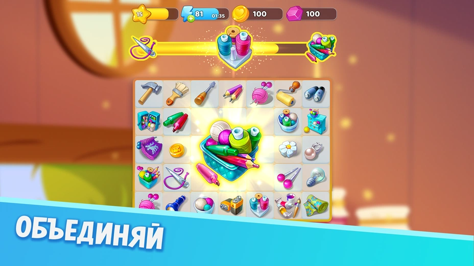 - 🟢 Объединяй предметы — перетаскивайте три одинаковых элемента друг на друга, чтобы получить один более продвинутый. Из семян — растения, из досок — стройматериалы, из ягод — варенье.