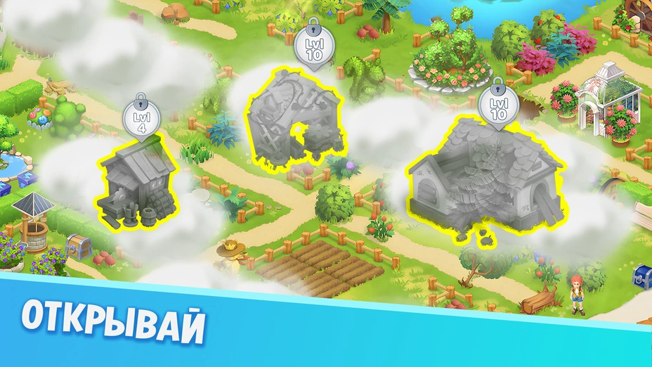 - 🧹 Очищай поле — на старте многие участки завалены мусором и зарослями. Убирайте их, освобождая место для новых построек и посадок.